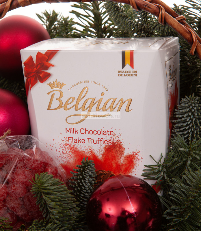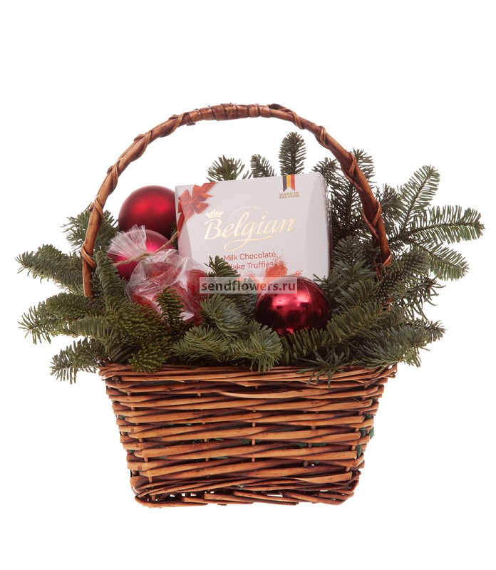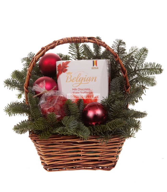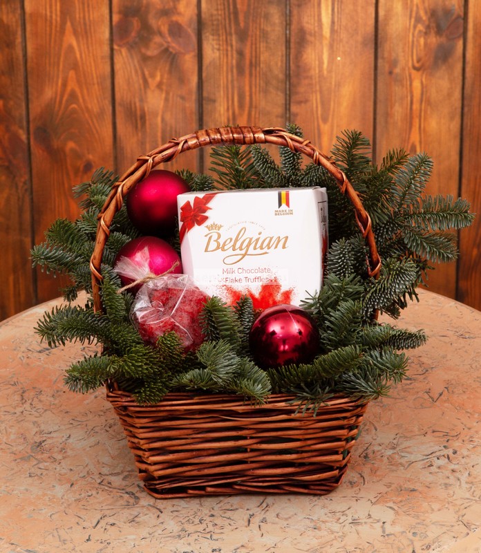 Состав: Оазис кирпич (1), Корзина малая (1), Лапник (1), Лента натуральная (2), Шар новогодний стандартный (пластик) (3), Трюфели The Belgian из мол. шок. в хлопьях 145г (1), Вишня сушёная,100 гр (1)